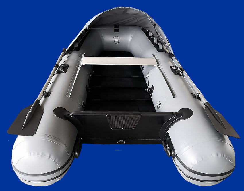 Les rames sont placées à l'intérieur du bateau pour laisser le desus des boudins libre.